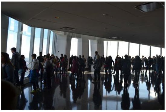Observation Deck on the 102nd Floor of One World Trade Center. Visitors take fast elevators that travel 394 m (1293 ft) from the ground floor to the observation deck in 47 s. (Photo by author).