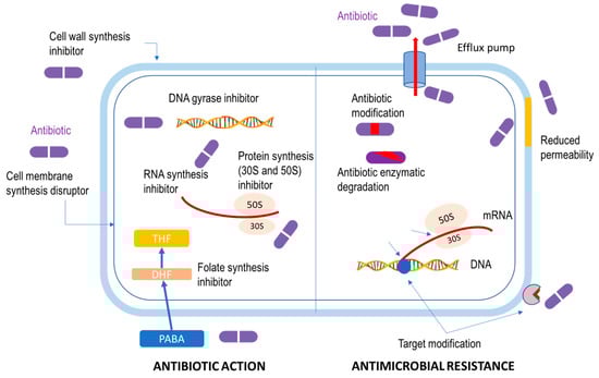 The main AMR mechanisms developed by resistant pathogens (Figure 1) include the presence of resistance genes in transposable elements such as in plasmids, reduction in uptake of antimicrobial agents (efflux of the antibiotic from the cell, biofilm formation, and permeability reduction), the presence of factors that affect the target antibiotic like enzymes, and mutation or alteration in the target site of antibiotics [40]. Table 2 lists the action modes and the resistance mechanisms of principal antibiotic classes.