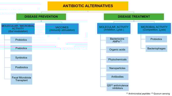 Considering the alarming consequences of AMR, new antibiotic alternative treatments which are more specific while eliminating deleterious side effects on the gut microbiota are crucial. These alternatives aim at maximally reducing the inappropriate and excessive use of antibiotics and should produce the same beneficial effects of such active molecules. Among the alternative candidates include molecular substitute classes such as bacteriocins, antimicrobial peptides, medicinal plants, and nanoparticles, which directly act by inhibiting or destroying pathogens, and microbial-based substitute classes such as bacteriophages, probiotics, and some vaccines [50]. The antibacterial mechanisms of the latter are based on either direct or indirect activities. For instance, bacteriophages are viruses that release their genetic material into bacteria, degrading the bacterial DNA, and ultimately killing them. Probiotics may directly act through antibiosis by producing metabolites such as bacteriocins, organic acids, antioxidant compounds, and nutrient-space competition, or indirectly by modulating the host’s gut microbiota and immune system, and can in this way reduce dysbiosis and bacterial infections, respectively. Figure 2 summarizes the main potential alternatives that have been considered to reduce the use of or even replace conventional antibiotics, and thus fight against AMR phenomena. Two alternative groups are distinguished according to their functions: (i) disease prevention through gut microbiota and immune system modulation (e.g., probiotics) and immune stimulation (e.g., vaccines), and (ii) disease treatment by reducing or suppressing bacterial infections (e.g., phage therapy, bacteriocins, nanoparticles, antibodies, and quorum-sensing anti-virulence inhibitors) [50].