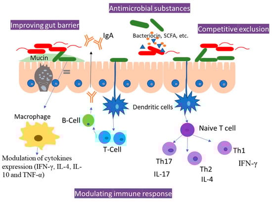 Probiotics have an impact on innate immunity by enhancing the cytotoxicity of natural killer (NK) cells and the phagocytosis of macrophages. They modulate the adaptive immunity by interacting with intestinal immune cells such as enterocytes, dendritic cells, and regulatory T cells [13].