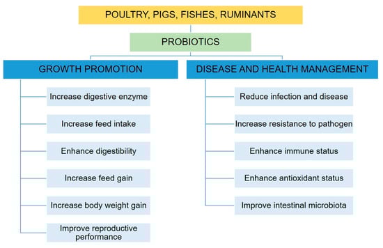 Antibiotics are often used in animal farming as antimicrobial agents for enhancing animal growth and production, as well as controlling diseases [138]. An evident use of probiotics instead of antibiotics is supported in the case of promoting animal growth, for which the goal consists of health development without specific infection targets [139,140]. A considerable number of probiotic strains are also capable of inhibiting diverse animal pathogens and may be potentially used as antibiotic alternatives in the farming sectors of poultry, swine, cattle, and others for enhancing immune function and disease prevention [10]. The benefits and inputs from probiotics as alternatives to antibiotics in animal health are outlined in Figure 4.
