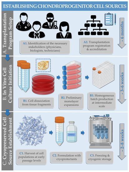 Modern quality, safety, and traceability requirements around the processing of cytotherapeutic materials for human investigational regenerative medicine use are currently stringent and necessitate extensive methodological planning and documentation [99]. Therein, good manufacturing practices (GMP) must be employed notably for combined advanced therapy medicinal products (cATMP), which encompass most bioengineered cartilage tissue grafts requiring cell culture steps (i.e., substantial manipulation of the cells) [72]. Furthermore, close consideration of the locally applicable legal and ethical framework is necessary for biological starting material (i.e., cartilage tissue) procurement and for subsequent clinical grade progenitor cell source establishment [71,99]. In particular, up-to-date legal and ethical guidelines must constitute the basis of the methodological devising of starting material procurement and bioprocessing for clinical cytotechnologies and cytotherapeutics [71]. These elements are key in view of demonstrating to national regulators and health authorities that specific primary progenitor cell sources are fit for human investigational clinical use. Therefore, the considered examples of FE002 primary progenitor cell sources were established in Switzerland under a validated progenitor cell transplantation program, with standardized whole-cell bioprocessing and cell banking in view of eventual clinical and commercial use (Figure 1) [71].