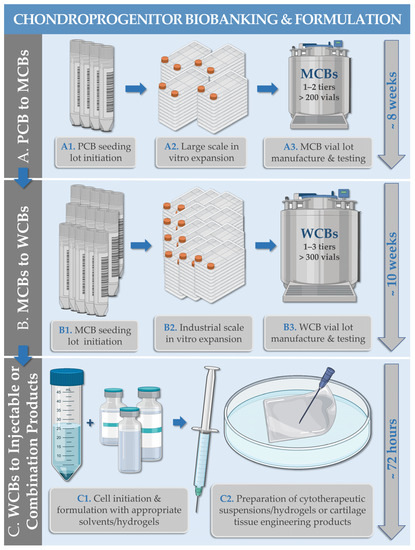 Schematic and illustrated methodological workflow describing the multi-tiered cell banking and some of the combined cytotherapeutic uses of primary chondroprogenitors (e.g., FE002 primary progenitor cell sources). (A1–A3) Parental cell bank (PCB) cellular materials (i.e., cells at early in vitro passage levels) are used to generate master cell bank (MCB) materials (i.e., cells at intermediate in vitro passage levels). (B1–B3) MCB cellular materials are used to generate working cell bank (WCB) materials (i.e., cells at in vitro passage levels appropriate for clinical use). (C1,C2) WCB cellular materials may eventually be used for off-the-freezer reconstitution of injectable combination products (e.g., cell suspensions in autologous serum-based solutions or hyaluronan-based hydrogels) or for seeding of bioengineered cartilage grafts (e.g., use of Chondro-Gide collagen scaffolds). Within GMP-compliant multi-tiered biobanking systems, the various cell bank tiers are characterized by the in vitro cell passage level or by the in vitro cell population doubling level of the corresponding cellular population, in the sequential order of increasing levels along the progenitor cell manufacturing workflow. Approximative timelines for individual phase execution are presented in blue font. GMP, good manufacturing practices; MCB, master cell bank; PCB, parental cell bank; WCB, working cell bank.