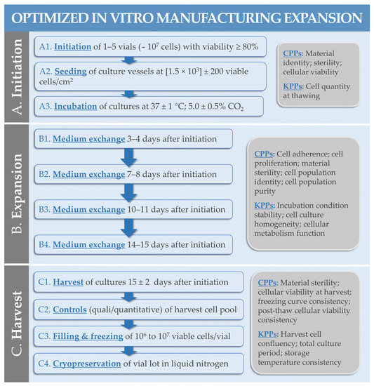 As previously mentioned for primary progenitor cell source establishment, the use of robust processes is essential for maintaining both the high quality and the sustainability of the considered biological source [72]. Therefore, process optimization studies and standardization work are critical early elements of industrial manufacturing process development and validation, enabling the specification of key and critical process parameters (KPP, CPP) or attributes [28]. Starting with seeding cell lots (i.e., usually parental cell bank (PCB) materials), all of the in vitro manufacturing activities are carried out according to conservative best practices of primary diploid cell culture (e.g., serial multi-tiered cell banking and cryopreserved vial lot manufacture, Figure 2) in grade A GMP manufacturing environments [72].