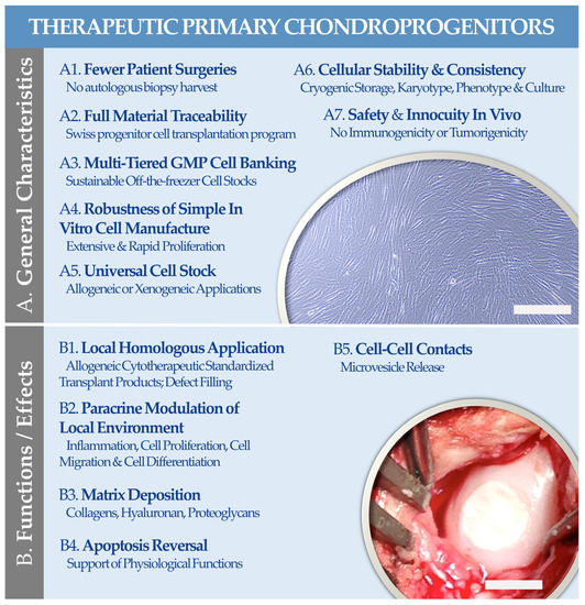 An illustrated summary of the (A1–A7) general characteristics and of the (B1–B5) possible functions or effects of FE002 primary chondroprogenitors for therapeutic use in allogeneic orthopedic regenerative medicine. (A) The illustration represents contrast phase microscopic records of adherent FE002 chondroprogenitors at the end of the in vitro proliferation phase. Scale bar = 100 µm. (B) The illustration represents a bioengineered cartilage graft, consisting of FE002 primary chondroprogenitors seeded on a bilayer collagen scaffold (Chondro-Gide, Geistlich Pharma, Wolhusen, Switzerland), following implantation in the knee joint in a GLP goat model of chondral defect. Scale bar = 7.5 mm. GLP, good laboratory practices; GMP, good manufacturing practices. Modified and adapted from [72].