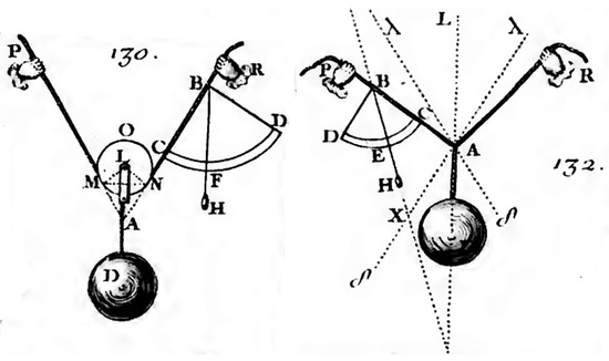 Notice that Maignan did not, however, speak of the force of the table on the ball; he just said that the ball suffers something from the table. No 16th and 17th century scholars of statics made explicit use of reaction as a force. This is also true of one of the most authoritative treatises on statics of the 18th century based on a mature concept of force (obeying the law of the parallelogram), that of Pierre Varignon (1654–1722), La nouvelle mécanique ou statique, published in 1725 after Varignon’s death but conceived much earlier [39]. In all cases, the forces were only the active ones and derive from muscular actions or weights. Very frequently, the forces are presented in drawings as hands that lift objects directly or by means of ropes, as shown in Figure 2.