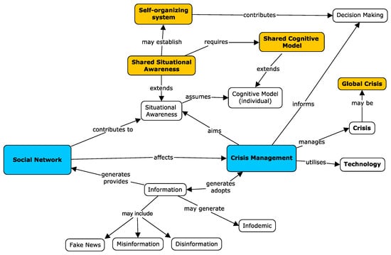 As extensively discussed, the generic potential role of Social Networks in the context of crisis management is well established and largely accepted [128]. The literature review provided a lot of evidence that supports the establishment of the well-researched area of crisis management and Social Networks and how Social Networks affect crisis management. However, the notions of a self-organising system, shared situation awareness, and a shared cognitive model are still under investigation in the literature. Those three emerging concepts that you can see at the top of the conceptual map diagram are identified in this study as research gaps that need further investigation.