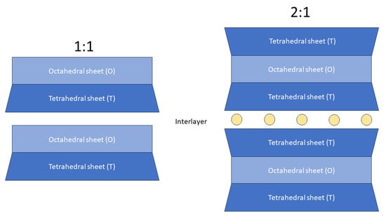 Nanoclays can be defined as nanoscale clay minerals sizing from about 100 nm to a few μm. Nano-sized clay minerals include smectite (vermiculite and montmorillonite), kaolinite, and illite depending on their chemical composition and applications []. Nanoclays consist of TOT layer stacks of about 10 nm in size. Thus, they have approximately 657 m2/g specific surface area compared to the micro-sized clays []. Nanoclays are low-cost, and nontoxic to human health or the environment. Physical, thermal, and chemical processes can produce nano-sized clays with enhanced adsorption capacity and mechanical strength []. Clay minerals as nano-sized units to produce nanomaterials are known as 21st-century green materials [].