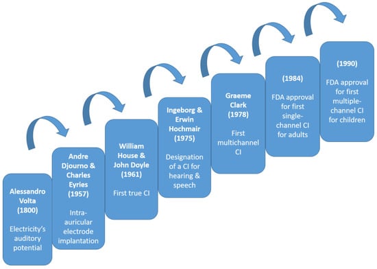 This manuscript endeavors to delve into the historical evolution of CIs, tracing their development from conceptualization to the cutting-edge devices we recognize today. By presenting a chronological narrative, we seek to highlight key milestones, technological advancements, and societal implications that have shaped the trajectory of CI innovation. Through this exploration, we strive to contribute to a comprehensive understanding of the historical context surrounding CIs, shedding light on the challenges overcome and the triumphs achieved in the journey towards enabling individuals with hearing impairment to experience the world of sound.