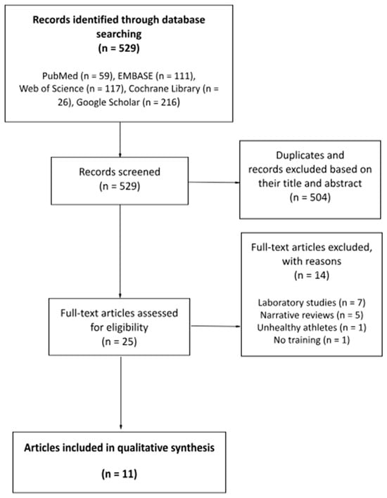 Overall, 529 articles (PubMed: 59; EMBASE: 111; Web of Science: 117; Cochrane Library: 26; Google Scholar: 216) were screened, and 11 of them were considered eligible for inclusion in this systematic review [,,,,,,,,,,]. The most important characteristics of these studies are summarized in Table 1. The article screening and selection process is described in a flow-diagram (Figure 1).