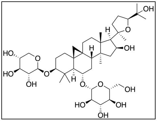 Biochemical structure of astragaloside IV, an active principle of Astragalus extracts. Image freely distributed under the Public Domain license and available at: https://en.wikipedia.org/wiki/Astragaloside#/media/File:Astragaloside_IV_Structure.svg (accessed on 16 October 2023).