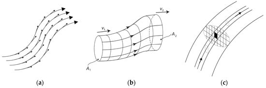 Lines of force: the small arrows indicate the direction and intensity of the electric or magnetic force exerted onto a small test charge or magnet at that point, the big arrows indicate the direction of the imaginary fluid motion analogous to the lines of force (a); a tube of fluid motion: are the mean velocity of the imaginary fluid when crossing the imaginary surfaces of area (b); a unit tube of fluid motion, where the arrows have the same meaning as in the previous portions of the figure and the imaginary surfaces crossed are meshed in small portions (c).