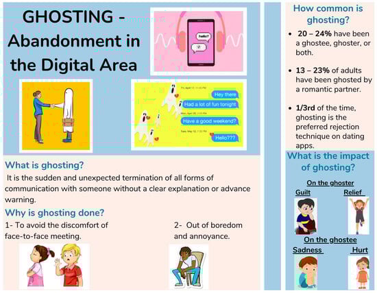Although never easy, there are various ways, from protective to cruel, of ending a relationship. These can vary from gradual to abrupt and from face-to-face discussion and in-depth explanation to silence and avoidance [,]. An extreme form of avoidance is called ghosting []. Ghosting is characterized by the sudden and unexpected termination of all forms of communication without a clear explanation or advanced discussion. This can happen either suddenly or gradually [,,]. It usually involves the act of “unfriending” or “unmatching” a person on social media [,], but it can be done through nonresponse to phone calls, emails, or text messages []. LeFebvre and colleagues, as well as Koessler and colleagues, argued that ghosting is limited to romantic relationships [,]. However, recent studies based on insights and interviews have demonstrated that this phenomenon also occurs in the context of friendships [,,]. A unique study performed by Forrai et al. further supported this contention, showing that ghosting a romantic partner is different than ghosting a friend. It was found that communication overload (i.e., the sense of being overwhelmed by the frequency of messaging) was a predictor of ghosting romantic partners, while self-esteem issues predicted ghosting friends. Additionally, the evidence suggests that ghosting within romantic relationships does not suffer long-term effects, whereas friend ghosting leads to depressive symptoms and has negative consequences for both the ghoster and the ghostee [].