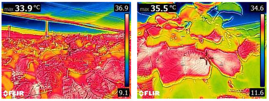 Overhead net installation on a kiwifruit orchard resulting in a reduced canopy heat load. On the left is the thermal image (above, left) of the net-covered kiwifruit canopy (below, left), and on the right is the thermal image of the uncovered canopy (above, right) in late summer (below, right) (from personal archive).