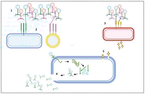 The interaction between a bacteriophage and the bacterial host drives the bactericidal activity of bacteriophages. This results in the development of a lytic cycle during which the bacteriophage phage genome replicates, followed by transcription and translation, resulting in capsid formation. After assembly, the host cell is lysed by the lytic enzymes called endolysins, in combination with the holins encoded by the phage genome, and the newly formed bacteriophages are released into the environment [79]. Globally, the lytic cycle of bacteriophages consists of an adsorption step (Figure 1), resulting in an irreversible adhesion to the bacterial cell surface involving interactions between the phage attachment proteins and their specific bacterial cell-surface receptors. The receptors are found in the outer membrane, such as LPS for Gram-negative bacteria or teichoic acid and lipoteichoic acid for Gram-positive bacteria on the bacterial cell wall. Efficient recognition of specific phage receptors leads to attachment of the virus and injection of genetic material into the host cell. This process is strictly dependent on the environment and its physico-chemical factors, pH, temperature, availability of nutrients or ions, and physiological state of the bacterial cell [80,81].