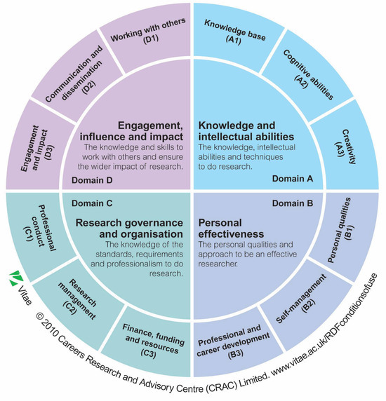 The Vitae Researcher Development Framework from Vitae, adapted from [9]. © 2010 Careers Research and Advisory Centre (CRAC) Limited, via www.vitae.ac.uk/rdf (accessed on 12 February 2024).
