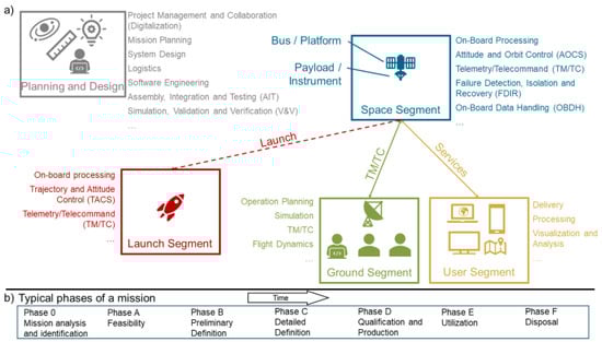 (a) Software as an indispensable part of a space system (i.e., space, launch, ground and user segments) and for space project execution. As a subsystem, it assumes vital functions in all segments, acts as “glue” for the different parts, and is essential for engineering activities (cf. [3,4]). The different segments are shown in different colors. (b) Typical project execution phases of a mission from left to right.