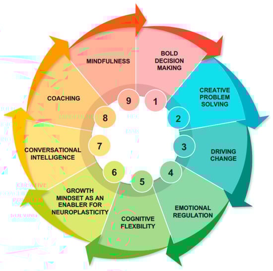 Cognitive flexibility, a cognitive skill, refers to the ability to adapt and switch between different cognitive strategies or mental processes in response to changing situations or tasks. It involves the capacity to shift one’s thinking patterns, generate alternative solutions, and adjust one’s mental approach when dealing with new or complex challenges. Cognitive flexibility is founded on the brain’s capacity to reconfigure neural networks and pathways to accommodate different cognitive demands, connecting it with neuroplasticity (the brain’s ability to develop new neural pathways). In the context of neuroleadership, cognitive flexibility serves as a valuable component, facilitating leaders’ capacity to navigate dynamic and uncertain scenarios, lead people through change, and quickly adapt when making decisions for the benefit of their teams and organizations [69,70,71].