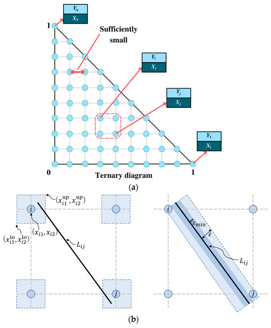 Figure 5a shows the discretized liquid composition space of a ternary diagram, which is a graphical representation for the separation of a ternary mixture, and