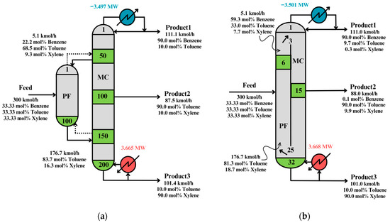13]. They proposed multipurpose mass and heat-transfer modules as the framework’s building blocks, as represented by a superstructure. This framework was applied for acetone recovery, benzene alkylation, ethylene glycol production, and heat integration. The GMF was applied for the separation of a benzene/toluene/o-xylene mixture based on aggregated physical models comprised by a superstructure, which then were reformulated as a mixed-integer nonlinear programming (MINLP) problem. The most energy-efficient distillation column sequence was the Petlyuk column, attaining 30% energy savings [
