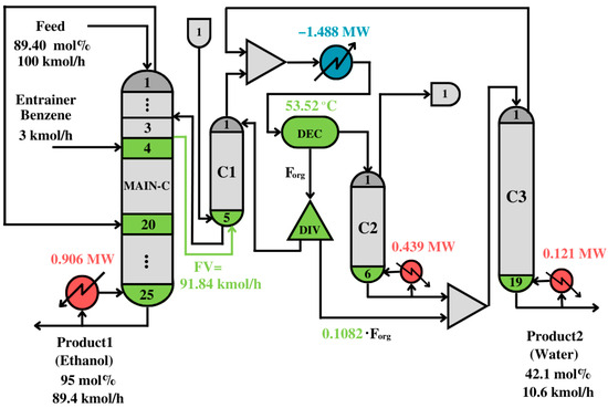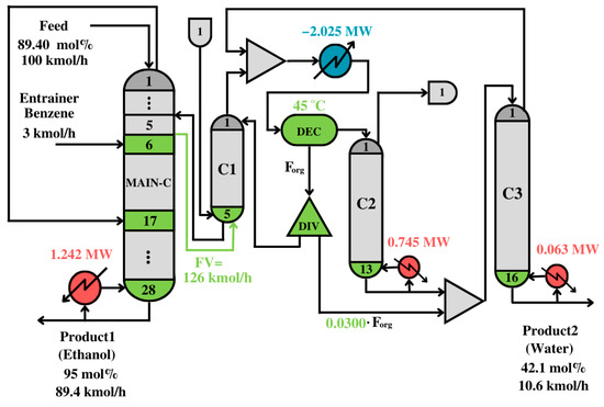 33], and consisting of three conventional columns and a decanter. The heat duty of the conventional process was 5.985 MW, which is almost twice the heat duty of the solution in