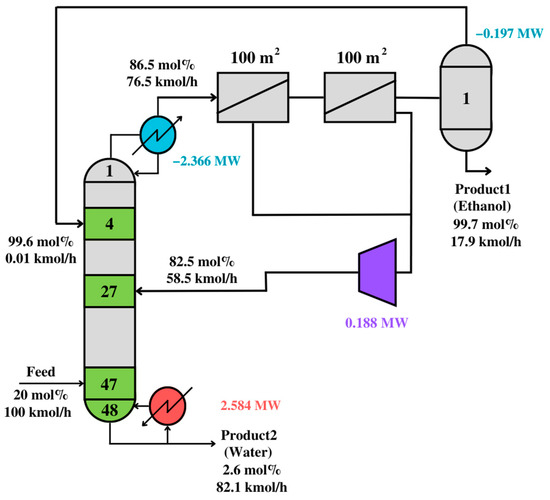 Membrane-assisted distillation is an alternative used to separate mixtures containing one homogeneous azeotrope. The separation is performed in this case because the sizes of the molecules are different. In this section, the ethanol/water separation is performed using a hydrophilic membrane made of polyvinyl alcohol (PVA), and it is also assumed that the membranes are replaced once a year [
