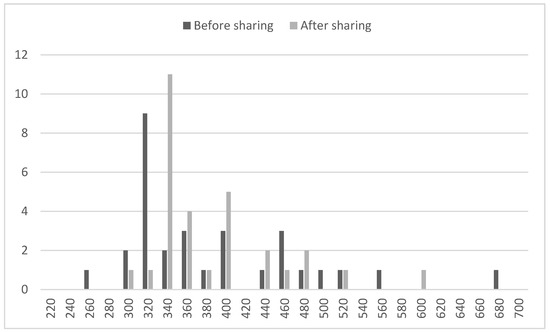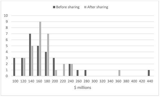 The compression effect of revenue sharing on team revenues was more pronounced for the 2023 season in Figure 2 when the contribution was 48%. The standard deviation of local club revenue fell from USD 93.3 million before revenue sharing to USD 65.5 million after revenue sharing, again with a significant decrease in skewness.
