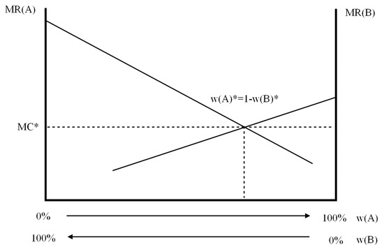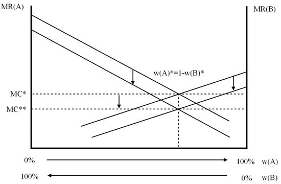 Why does appear in (9)? Team A increases its net revenue by when it increases its winning percentage, due to its share of the higher local revenue in the first term in (9), part of which is returned from the central pool. Team B’s winning percentage falls by the same amount as the increase for team A (, due to the adding up property) and its local revenue decreases, resulting in a smaller contribution to the central fund. Team A must absorb of the fall in team B’s local revenue from the central fund since The same effect holds for team B in (10). Figure 5 depicts the downward shifts in marginal revenues. The marginal cost of winning is also reduced at the profit-maximizing league equilibrium, much to the displeasure of the players.