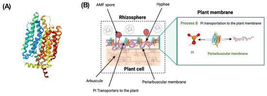 | Phosphate transporters | Pi is released from the arbuscular into the peri arbuscular membrane by the PHT1 transporter. | PHT (e.g., PHT1) family transport mycorrhiza-specific nutrients, inducible through AMF symbiosis with plant hosts, from the soil to the shoot and mycorrhizal symbiotic interface. | Phosphate transporters, such as the PHT1 family, are present in plant roots’ root epidermis and are expressed for the uptake of phosphate. | [39,40,41] |