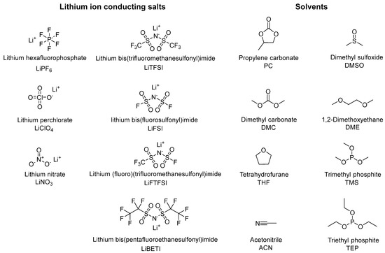 - Pappenfus, T.M.; Henderson, W.A.; Owens, B.B.; Mann, K.R.; Smyrl, W.H. Complexes of Lithium Imide Salts with Tetraglyme and Their Polyelectrolyte Composite Materials. J. Electrochem. Soc. 2004, 151, A209. [Google Scholar] [CrossRef]