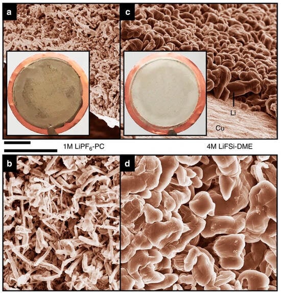 - Jeong, S.-K.; Seo, H.-Y.; Kim, D.-H.; Han, H.-K.; Kim, J.-G.; Lee, Y.B.; Iriyama, Y.; Abe, T.; Ogumi, Z. Suppression of dendritic lithium formation by using concentrated electrolyte solutions. Electrochem. Commun. 2008, 10, 635–638. [Google Scholar] [CrossRef]
