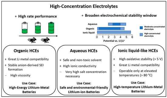 - Wang, J.; Zheng, Q.; Fang, M.; Ko, S.; Yamada, Y.; Yamada, A. Concentrated Electrolytes Widen the Operating Temperature Range of Lithium-Ion Batteries. Adv. Sci. 2021, 8, e2101646. [Google Scholar] [CrossRef] [PubMed]