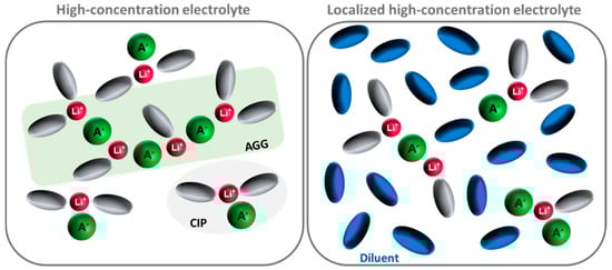 - Cao, X.; Jia, H.; Xu, W.; Zhang, J.-G. Review—Localized High-Concentration Electrolytes for Lithium Batteries. J. Electrochem. Soc. 2021, 168, 10522. [Google Scholar] [CrossRef]