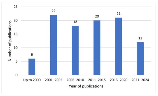 Compared to the initial Google Scholar sample of 366 references and due to the manual selection, the period of 2001–2005 is slightly overrepresented while the period of 2021–2024 is underrepresented. More than 40 papers are from non-English speaking countries.