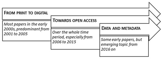 With the rise of open science as a prevalent research policy in numerous countries and institutions, ensuring open access became another challenge, if not a priority for ETD programs: “With more organizational interest in the growing Institutional Repository movement, the links between ETDs and institutional repositories is not only natural but well positioned as open access and archival preservation techniques become common in electronic and scholarly publishing” [60]. Papers addressing issues related to open access (OA) have been published since 2001 and continue to be released to this day.