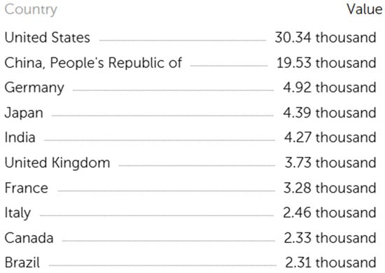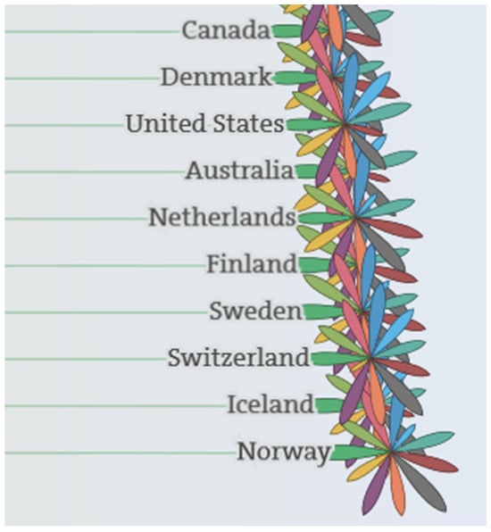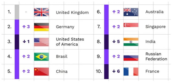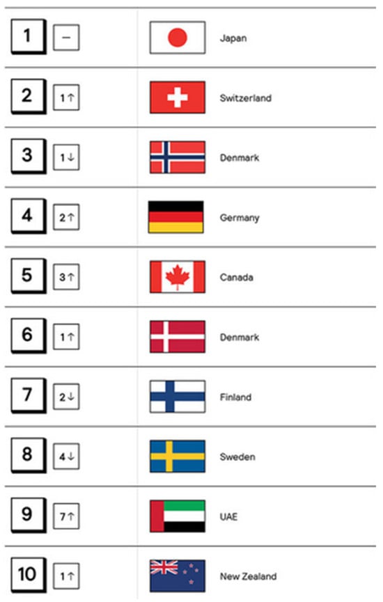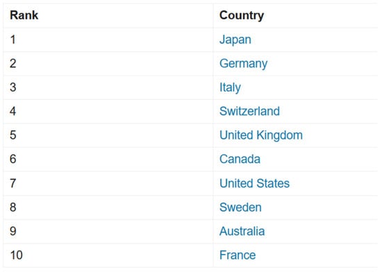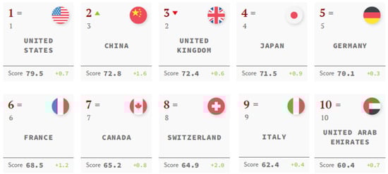 - The second ranking focuses on international trade information. Its data combination includes the tangible economic success of a country’s investment promotion strategy, based on inflows and growth reported by the United Nations Conference on Trade and Development (UNCTAD), and/or national investment promotion agencies (IPA). Furthermore, a dedicated tool measures the online search volume for socio-economic factors and investment-related sectors in a specific country. In addition, a country brand obtains a high score if its IPA’s strategy is shaped around the trade-related brand tags with the highest demand in terms of search volume. IPA data are also used through website analysis and social media data to determine the general visibility of the country brand [41,42]. The 2024/2025 edition of the Country Brand Ranking—Trade Edition provided the following top ten results (Figure 8).