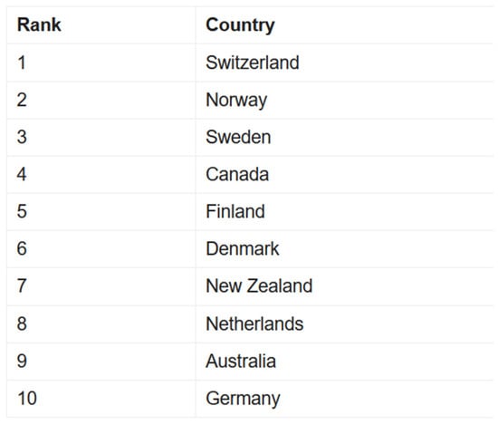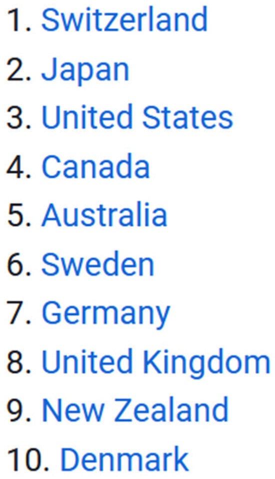 - US News. Frequently Asked Questions: 2024 Best Countries. 2024. Available online: https://www.usnews.com/news/best-countries/articles/frequently-asked-questions (accessed on 11 January 2025).