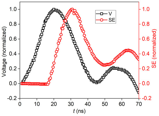 Oscillating and time-delayed normalized signals of voltage (V, black squares) and spontaneous emission (SE, red circles) for a discharged pumped nitrogen gas at a pressure 4 kPa (peak voltage: 24 kV). A time delay in the range of 10 ns between excitation and emission was found.