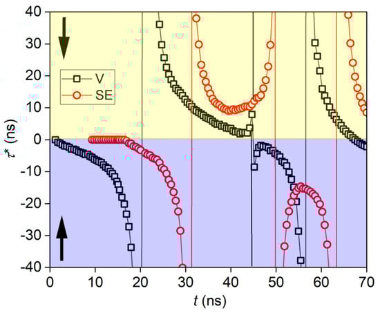 The detection wavelength corresponding to the laser transition is representative of the most relevant energy transfer channel for this type of laser. Amplified spontaneous emission (ASE) was suppressed to directly derive a time-dependent small signal gain of the (0,0) transition of the second positive system (C3Πu → B2Πg) of the N2 molecules. The corresponding parameters of τ*(t) according to Equation (5) are compared in Figure 2.