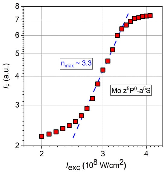 A particular example for a nonlinear photolytical process is presented in Figure 3 by the gas-phase multiphoton dissociation of Mo(CO)6 (molybdenum hexacarbonyl) at XeCl-laser wavelengths of around 308 nm and a pulse duration of 7.5 ns. The gas pressure was stabilized at 20 Pa without additional buffer gas. The intensity-dependent emission line of the molybdenum atom transition z5P0-a5S (J2 = 3 to J1 = 2, wavelength 550.649 nm [61]) is depicted in a double-logarithmic plot [62]. The maximum slope of the quasi-linear part corresponds to a nonlinear exponent of about nmax = 3.3 between laser intensities of 2.5 × 108 W/cm2 and 3.3 × 108 W/cm2, which indicates a sequential multiphoton excitation mechanism involving at least three photons. At intensities above 3.3 × 108 W/cm2, saturation behavior is observed. The intensity-dependent nonlinear exponents n(IL) along the entire curve can be determined by applying Equation (7). Assuming a dissociation energy of 9.44 eV for a complete release of all ligands [63,64,65] and a three-step excitation with photon-energies of 4.03 eV, an excess energy of up to 2.59 eV can be expected (in contrast to the values reported in [65], which were calculated for a different photon energy). The experimentally detected nonlinear order widely confirms this model and an additional contribution of a four-photon excitation channel seems to play a role.