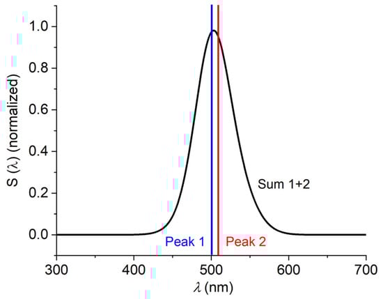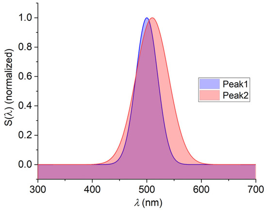 Two overlapping Gaussian peaks of equal peak intensity and small spectral distance with slightly different HWHMs (σ1 = 10 nm, σ2 = 15 nm) at center wavelengths of µ1 = 500 nm and µ2 = 510 nm, respectively (numerically simulated).