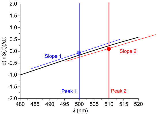 The approach linearizes the problem. Figure 5, Figure 6 and Figure 7 visualize the principle of linearization schematically for two adjacent Gaussian peaks of a small spectral distance and equal maximum intensity. The existence of two peaks is clearly indicated by the different slopes.