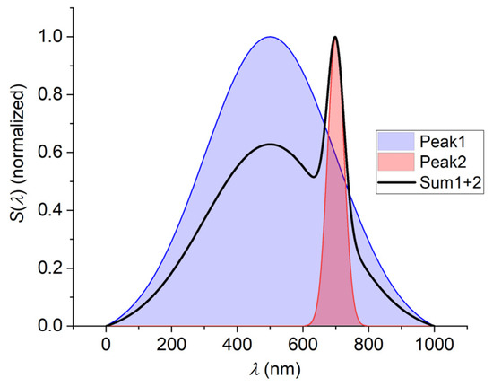 Simulated superposition of two Gaussian peaks of equal intensity and significantly different HWHMs (σ1 = 200 nm, σ2 = 25 nm) located at wavelengths of µ1 = 500 nm and µ2 = 700 nm (normalized spectral intensities).