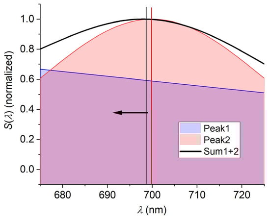 Magnified region of the spectra in Figure 8 (normalized). Due to numerical simulation, the peak with smaller HWHM (peak 2) is shifted by about Δλ = 2 nm towards the peak with larger HWHM (peak 1) as a result of the asymmetric background (arrow indicates the direction of shift).
