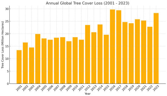 Annual global tree cover loss, 2001–2023. Source: Global Forest Watch, 2025 (https://www.globalforestwatch.org/dashboards/global/) (accessed on 23 March 2025).