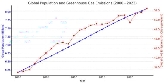 Association between global population growth and greenhouse gas emissions (2000–2023). Sources: UN World Population Prospects: The 2024 Revision []; European Commission, EDGAR Emissions Database for Global Atmospheric Research, 2025. https://edgar.jrc.ec.europa.eu/ (accessed on 23 March 2025).
