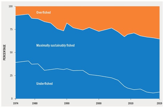 Fraction of fishery stocks within biologically sustainable levels that have decreased (1974–2019). Adapted from [].