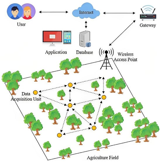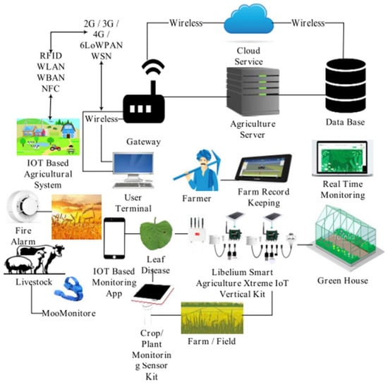 An overall smart agricultural system is presented in Figure 3. This figure demonstrates how various components, including IoT-based sensors, wireless communication protocols, and automated control systems, work together to enhance agricultural productivity and sustainability.