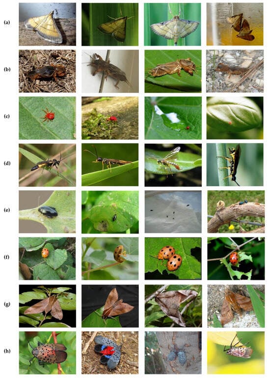Photos of some harmful pests: (a) rice leaf roller; (b) mole cricket; (c) red spider; (d) wheat sawfly; (e) flea beetle; (f) Coccinella septempunctata; (g) Ampelophaga; (h) Lycorma delicatula. Reprinted from ref. [45].