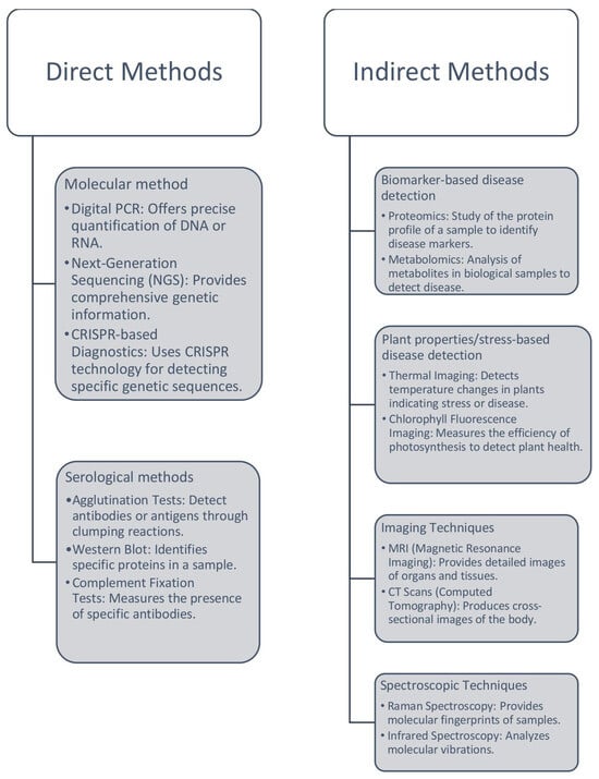 The significant impact that plant diseases have on crop production has been studied extensively [46,47,48,49,50]. Techniques for identifying plant diseases include enzyme-linked immunosorbent assays (ELISA) and polymerase chain reactions (PCR). These methods involve thorough collection and processing, which can cause delays in disease identification. New technologies apply various techniques that can be integrated into sensor systems, such as spectroscopic techniques for imaging and volatile organic compound (VOC) profiling for disease detection. Table 5 summarizes recent studies on plant disease detection using molecular techniques. It highlights various detection methods such as ELISA, PCR, quantitative PCR (qPCR), loop-mediated isothermal amplification (LAMP), and next-generation sequencing (NGS), applied to a range of plant-pathogen interactions. These techniques play a crucial role in early disease identification, which is essential for effective crop protection and sustainable agricultural management. The authors [51] extensively reviewed AI and automation techniques, highlighting the application of all-terrain vehicles integrated with multispectral imaging sensors to achieve early-stage disease detection, thereby improving intervention strategies and minimizing crop losses.